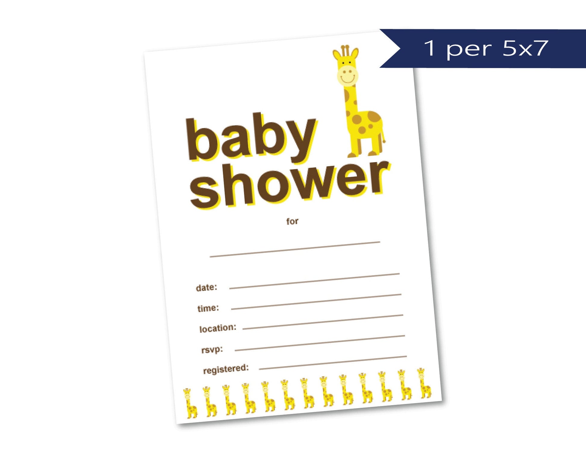 This giraffe baby shower invitation is fill-in-the-blank for your convenience. Add the name, date, time and other party info. This party invite is a perfect compliment to your zoo themed shower.