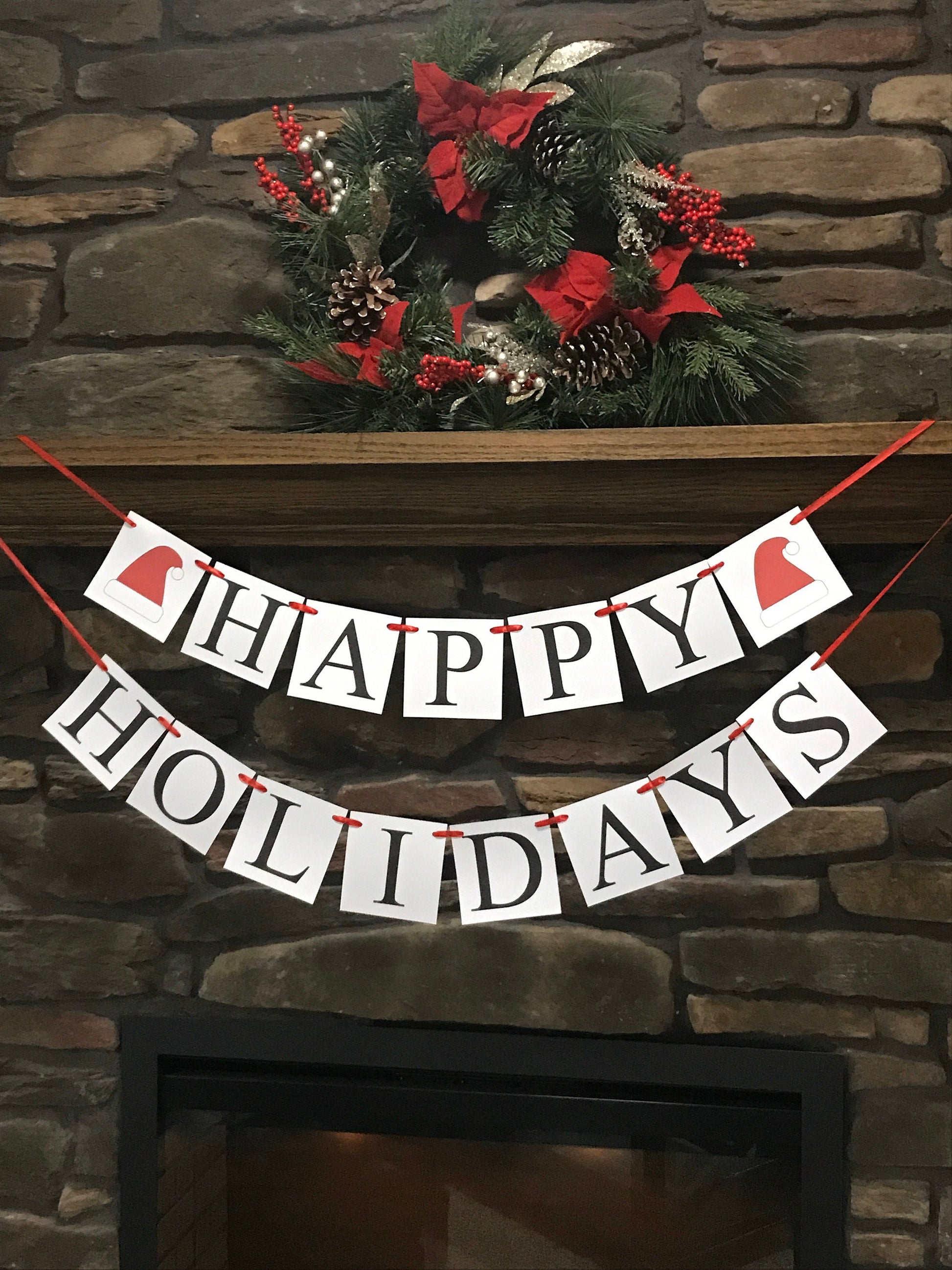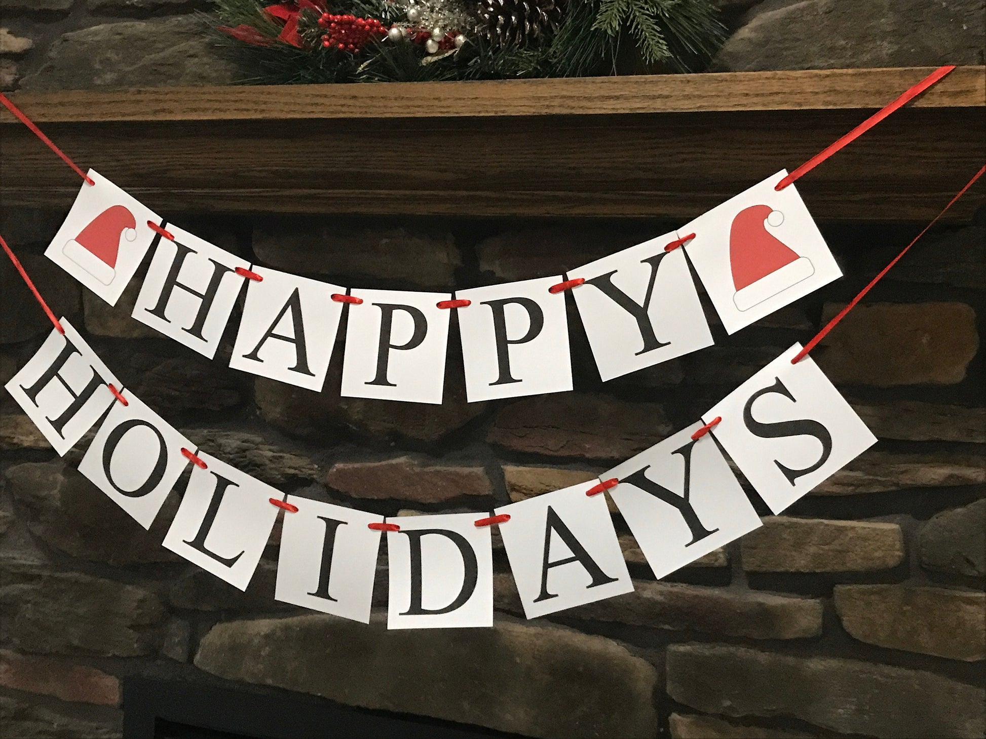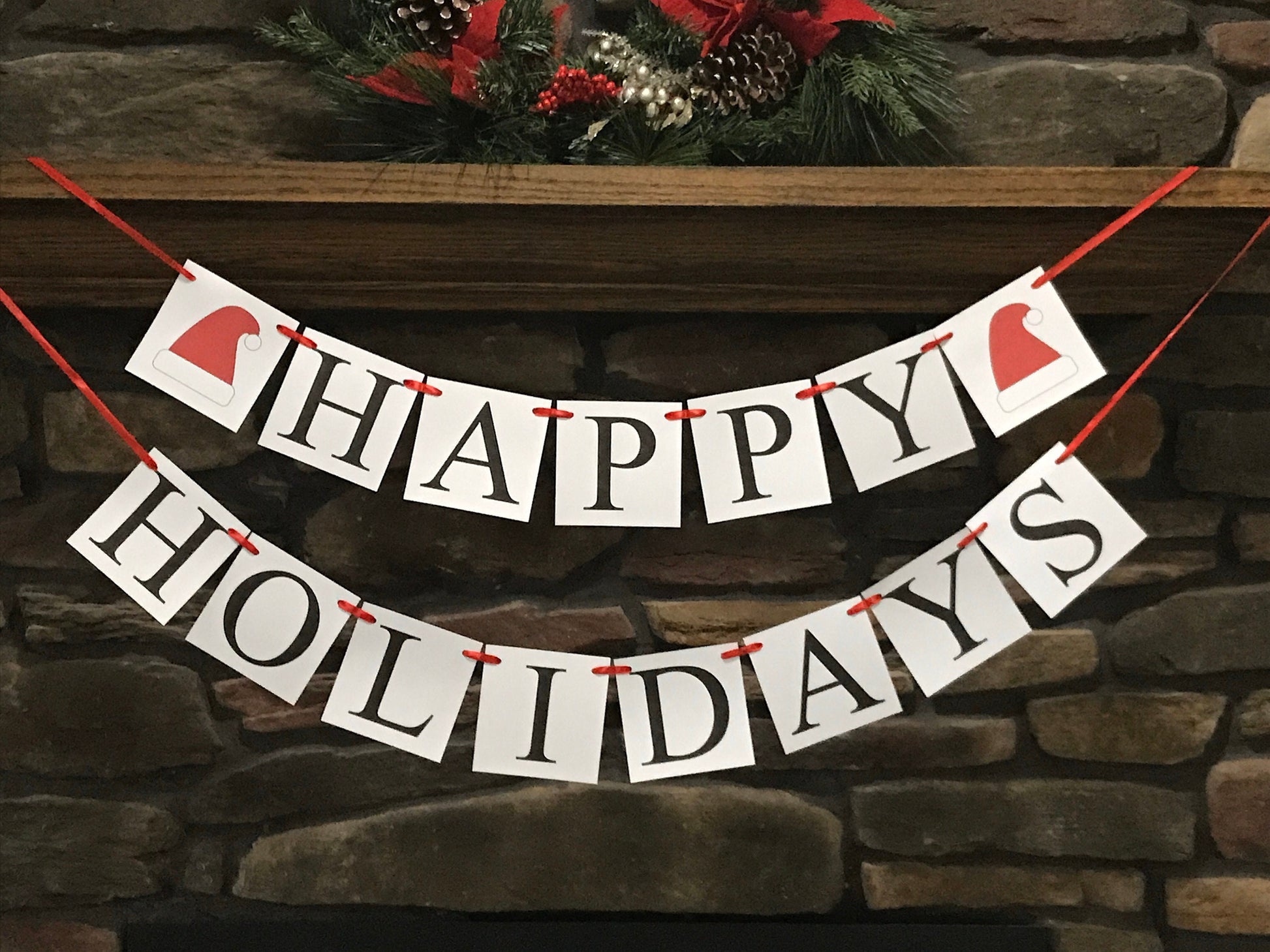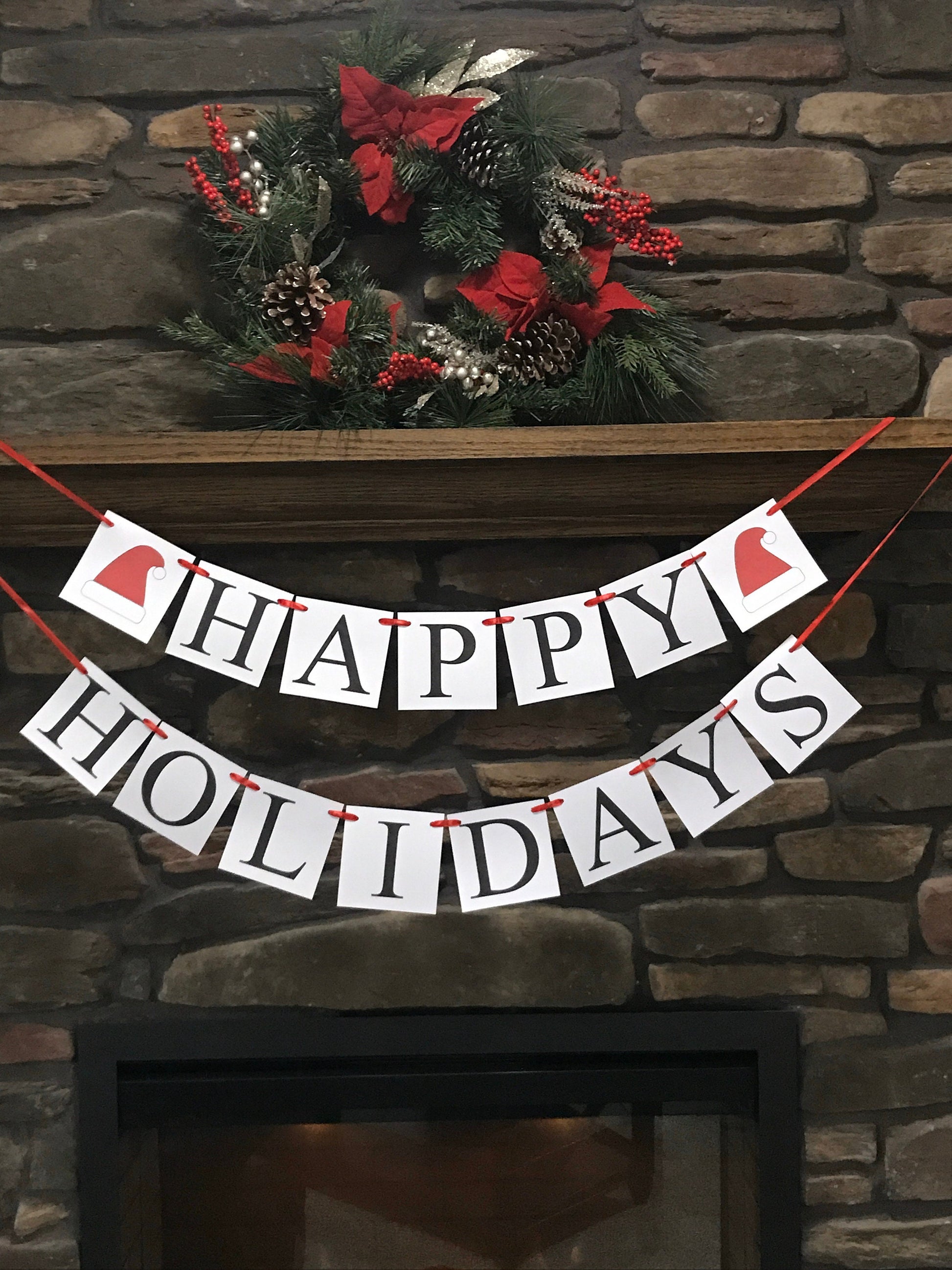 A festive Santa hat Happy Holidays banner. Hang this holiday bunting along your fireplace mantel, dining room buffet, bookcases and more. This happy holidays bunting comes as a 2 piece banner set. Each banner can be hung separately or together.