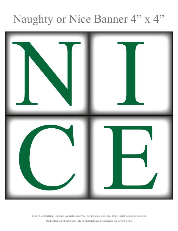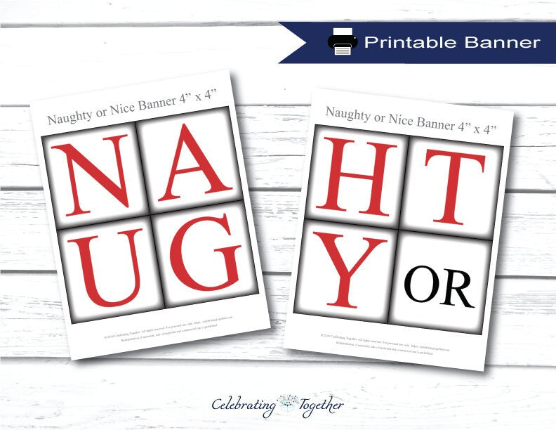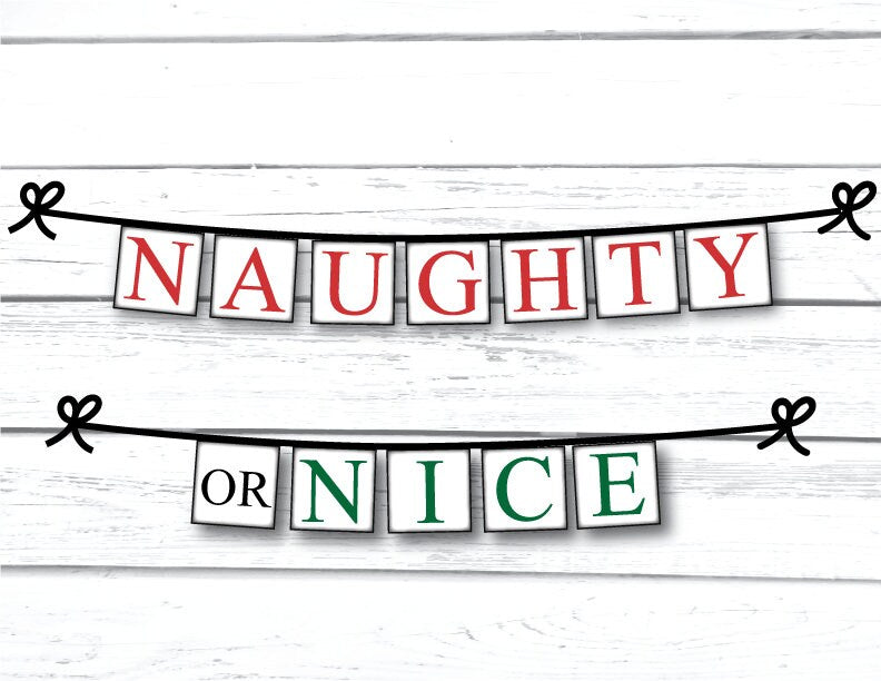 Naughty or Nice banner is perfect for sprucing up your winter and holiday decorations. Designed on 4" x 4" white cardstock with black, red and green lettering. Each block is trimmed with a black ink along the edges. This holiday sign measures approximately 48". Great Christmas decoration for families with little kids who still believe in Santa.